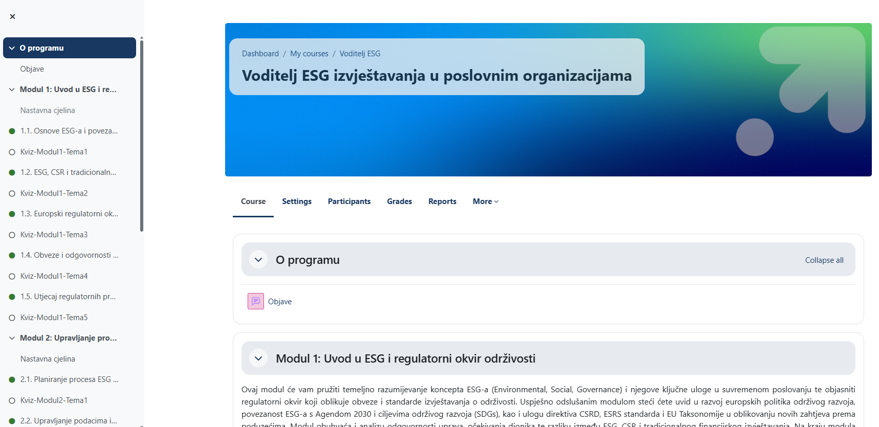 In addition to online learning materials, the programme includes interactive workshops titled “ESG Reporting Manager in Business Organisations”, designed for participants who wish to apply their knowledge in practice and develop concrete tools for implementing ESG systems within their organisations.